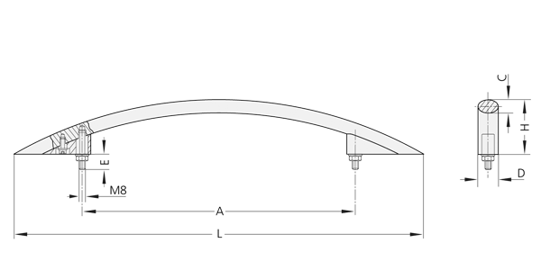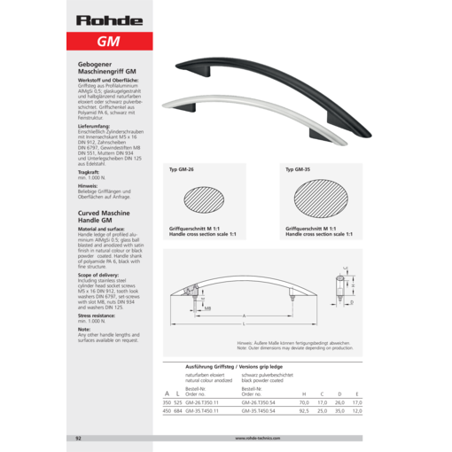 Madlo rukojeti z profilovaného hliníku AlMgSi 0,5; matně poniklovaný povrch (otryskaný skleněnými kuličkami) a pololesklý, eloxovaný v přírodní barvě nebo ošetřen černou práškovou nátěrovou hmotou. Připevňovací ramínko rukojeti z polyamidu PA6, černá s jemnou strukturou.