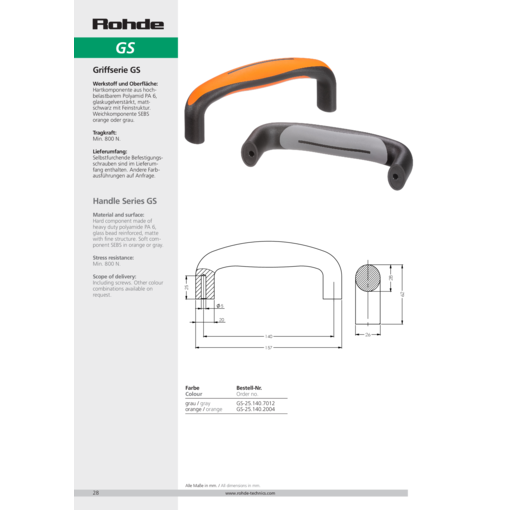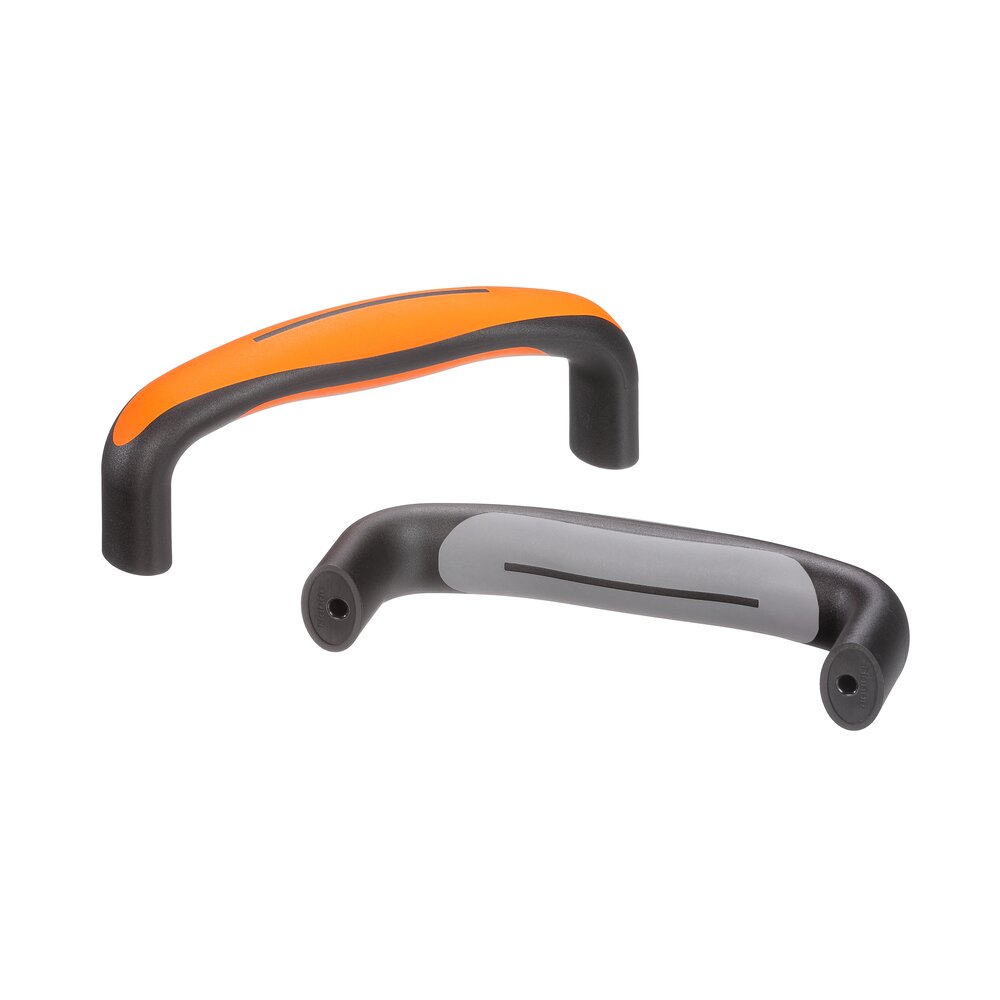 Hartkomponente aus hochbelastbarem Polyamid PA 6, glaskugelverstärkt, mattschwarz mit Feinstruktur. Weichkomponente SEBS orange oder grau.