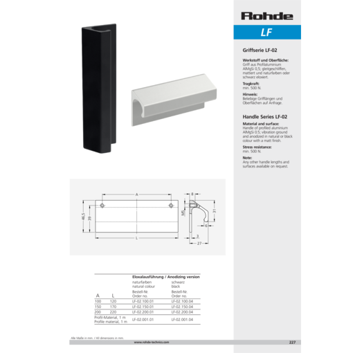 Handle of profiled aluminium AlMgSi 0.5; vibration ground and anodized in natural or black colour with a matt finish.