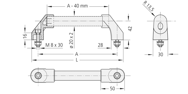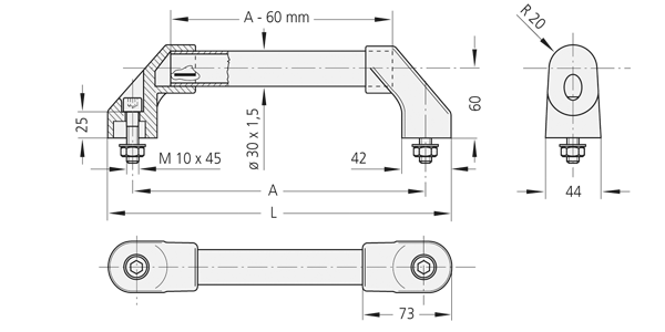 Handle shanks and blanking caps made of high duty polyamide PA6, glass ball reinforced, black, similar to RAL 9005, half-matt, with fine structure. Connecting tubes made of aluminium AIMgSi 0.5.