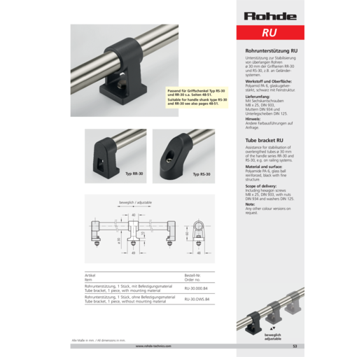 Assistance for stabilisation of overlengthed tubes ø30 mm of the handle series RR-30 and RS-30, e.g. on railing systems.
