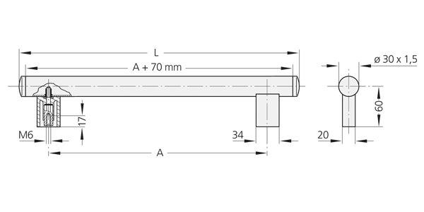 Tubes of ø30x1.5 mm aluminium AlMgSi 0.5; fine ground, natural coloured anodized or black powdercoated, with fine structure. Alternativ tube made of stainless steel, material no. 1.4031; fine ground. Tube holders and tube caps made of polyamide PA6, glass bead reinforced, black, half-matt with fine structure. Tube threaded insert made of aluminium, screw-down insert made of steel, galvanized.