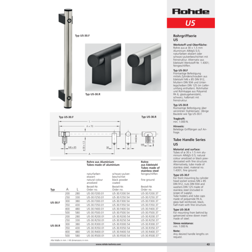 Tubes of ø30x1.5 mm aluminium AlMgSi 0.5; natural colour anodized or black powdercoated with fine structure. Alternatively, tube made of stainless steel, material no. 1.4301; fine ground.