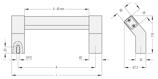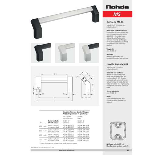 Handle shanks and handle ledge made of extruded aluminium AlMgSi 0.5. Shanks anodized with a matte finish in natural colour or black. Handle ledge anodized in a high quality, satin finish in natural colour or black.
