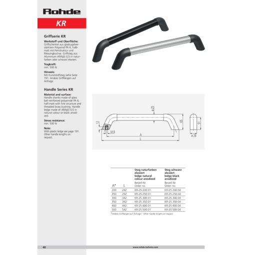 Handle shanks made of glass ball reinforced polyamide PA 6 , flat-lustrous with fine structure and threaded brass bushing. Handle ledge made of aluminum AlMgSi 0,5 in natural color or black anodized.