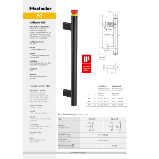 | Product Type FG5-21 | Description 1 emergency stop with lighting | A 400 | L 542 | Order-No. FG5-21.400.54 3D+CAD |