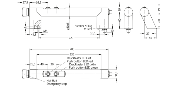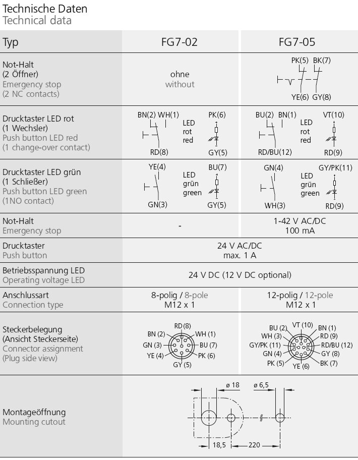 2 Push buttons up to 1A with LED. Type FG7-05 with additional emergency stop (2 NC contacts).