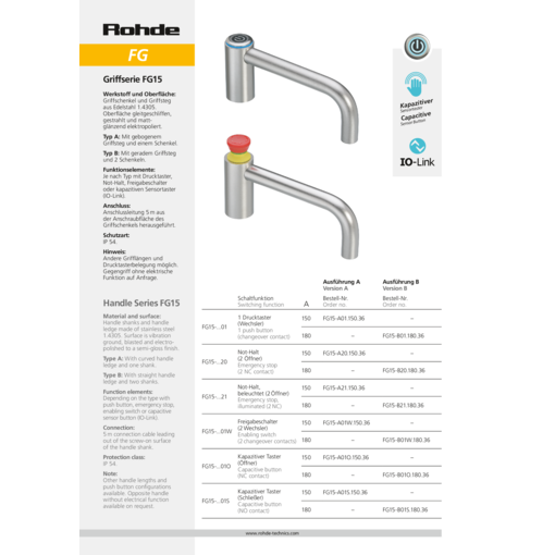 | Type FG15-B01 | Switching function 1 push button | A 180 |