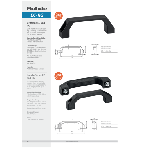 High temperature resistant handles. Short term suitable for applications up to 250 °C or for longer periods up to 150 °C.