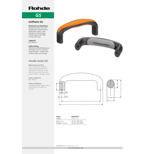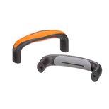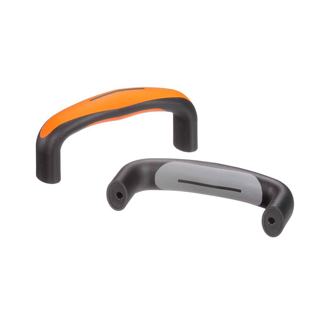 Hard component made of black heavy duty polyamide PA 6, glass ball reinforced, matt with fine structure. Soft component made of SEBS, basalt grey RAL 7012.