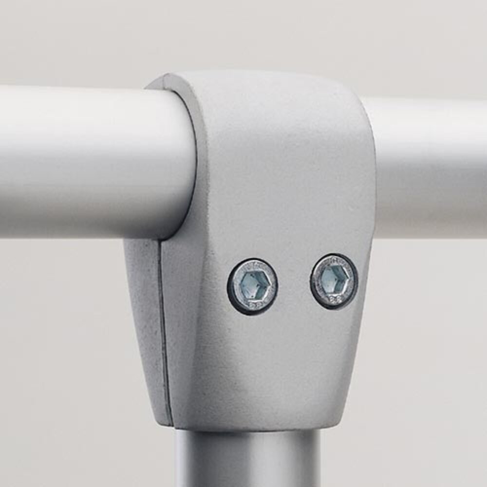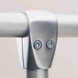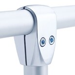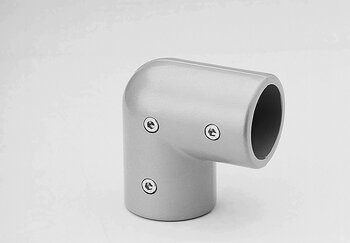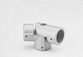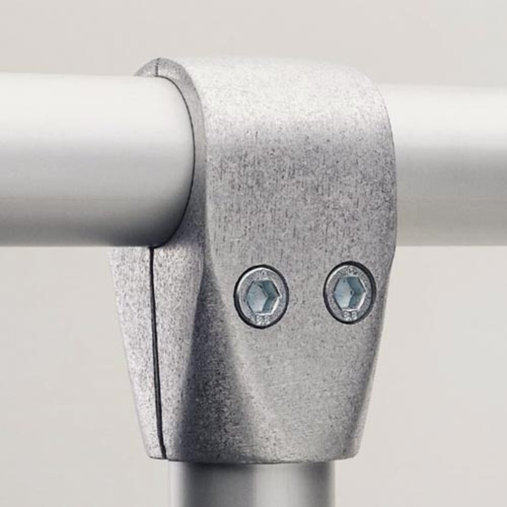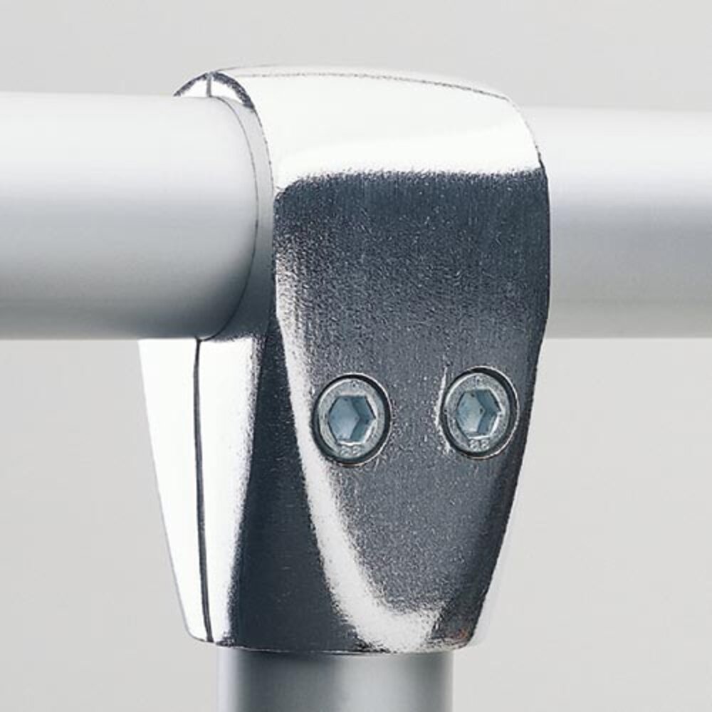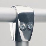 Silver two-layered cross tube connector with central circular opening and hex screws
