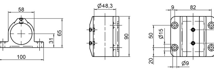 Technical line drawing showing front, side, and top views of a single-channel wall bracket tube connector with dimensions and hole placements in millimeters.