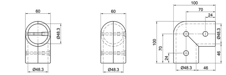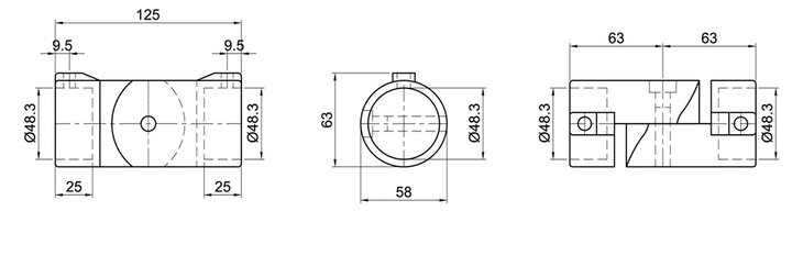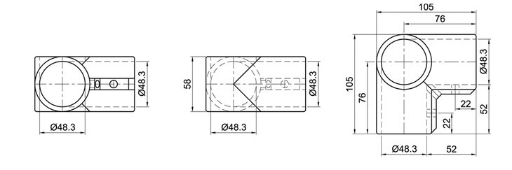 Technical line drawing of a two-shell T-shaped tube connector with three orthographic views and dimensional annotations