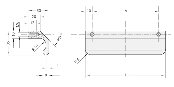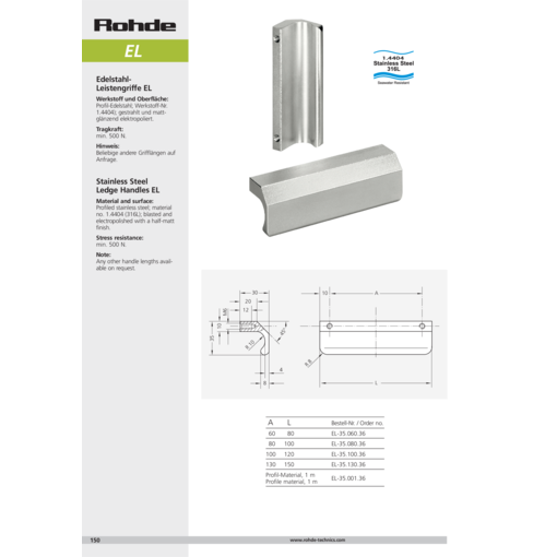 Profiled stainless steel; material no. 1.4404; blasted and electropolished with a half-matt finish.