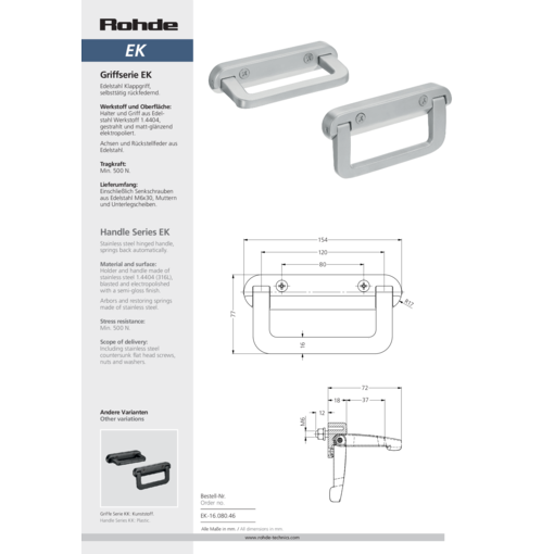 Holder and handle made of stainless steel 1.4404 (316L), blasted and electropolished with a semi-gloss finish.