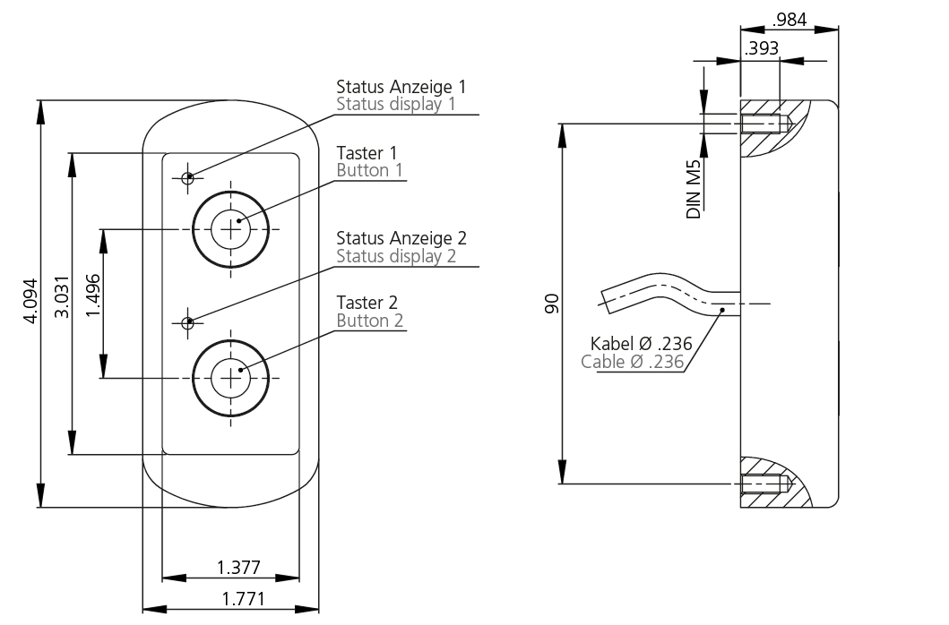 Membrane keypad with 2 illuminated push-buttons (NO contact) and status display red or green.