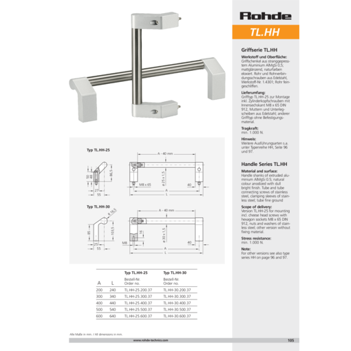 Version TL.HH-25 for mounting incl. cheese head screws with hexagon sockets M8x65 DIN 912, nuts and washers of stainless steel; other version without fixing material.