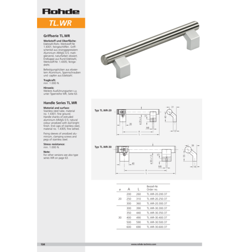Stainless steel tube, material no. 1.4301; fine ground. Handle shanks of extruded aluminium AlMgSi 0.5; natural colour anodized with dull bright finish. End caps of stainless steel, material no. 1.4305; fine lathed. Fixing sleeves of anodized aluminium, clamping screws and pegs of stainless steel.