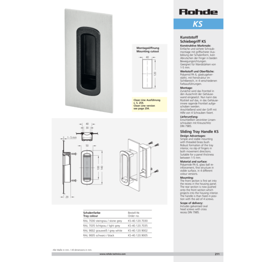 Simple and stable mounting with threaded brass bush. Robust formation of the tray interior, no slip of fingers in both movement directions. Suitable for a panel thickness between 1-5 mm.