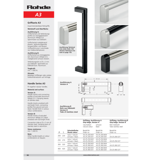 Ramię uchwytu i profile połączeniowe z tłoczonego pasmowo aluminium AlMgSi 0,5. Tuleje mocujące ze stali szlachetnej. Ramię uchwytu eloksalowane matowo-wybłyszczająco, szlifowane na gładko i eloksalowane. Wersje uchwytu dostępne w kolorze naturalnym i czarnym.