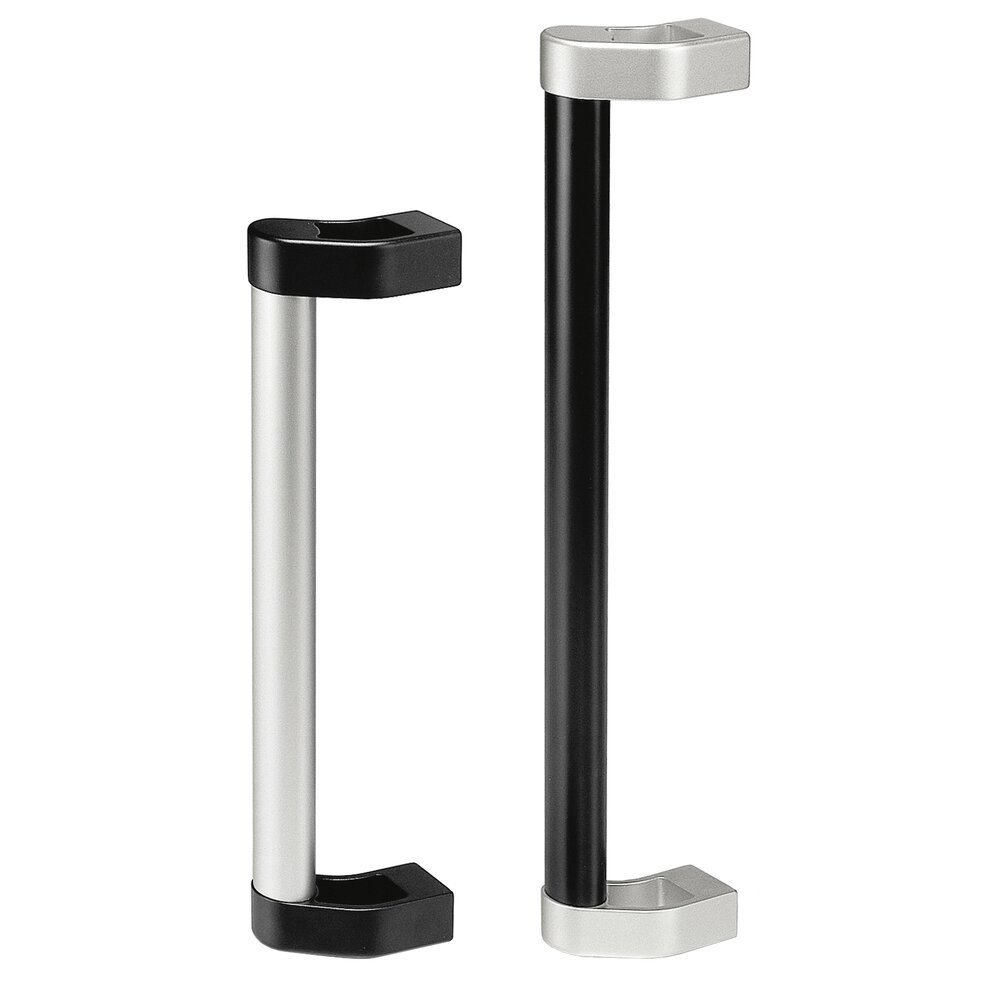 Wygięty uchwyt rurkowy z owalnym mostkiem w różnych połączeniach kolorystycznych.