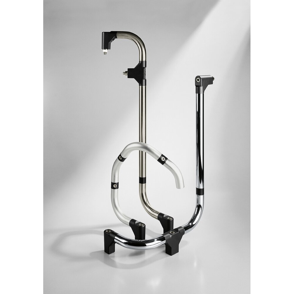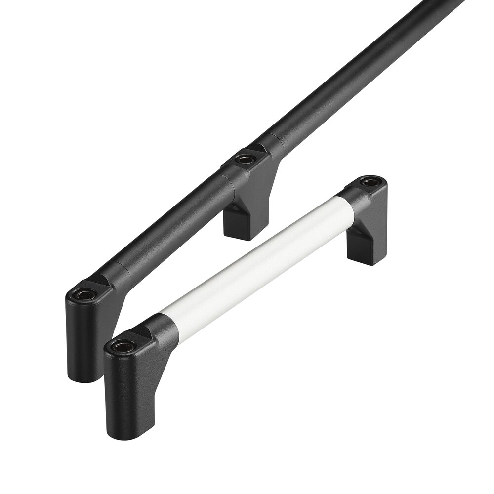 Łączniki kształtowe z odlewanego ciśnieniowo aluminium, powlekanego proszkowo na kolor czarny, półmatowy, o drobnej strukturze. Śruby i elementy mocujące ze stali, ocynkowane i chromianowane. Dostawa w stanie zmontowanym, łączniki zakończeniowe i teowniki wraz z czarnymi śrubami mocującymi wg rysunków.