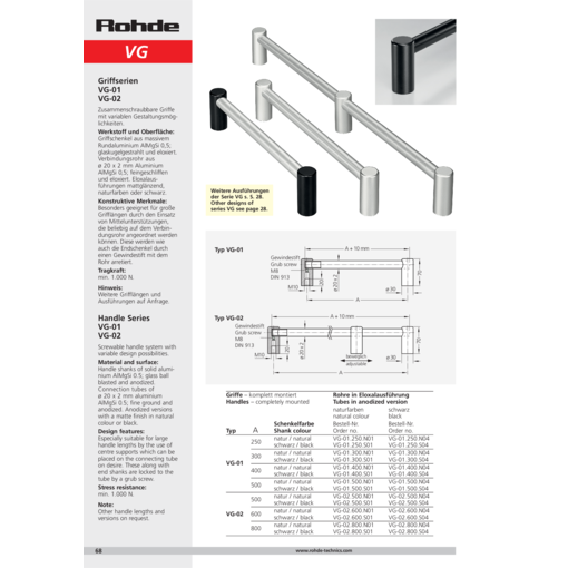 Ramię uchwytu z masywnego profilu okrągłego z aluminium AlMgSi 0,5, kulkowanego strumieniowo i eloksalowanego. Rurka połączeniowa ø20x2 mm z aluminium AlMgSi 0,5, precyzyjnie szlifowana i eloksalowana. Wersje eloksalowane matowo-błyszczące w kolorze naturalnym i czarnym.