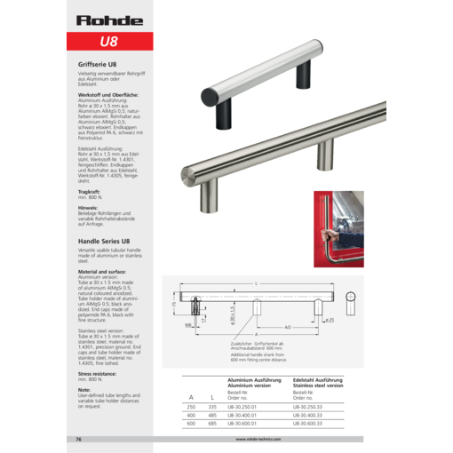 tubo ø30x1,5 mm em alumínio AlMgSi 0,5; anodizado em cores naturais. Porta-tubo em alumínio AlMgSi 0,5; anodizado preto. Tampas em poliamida PA6, pretas com estrutura fina.
