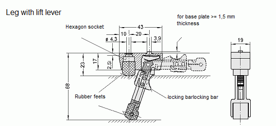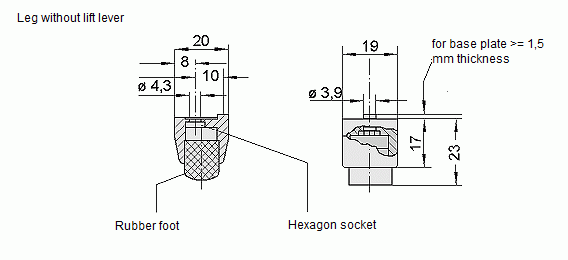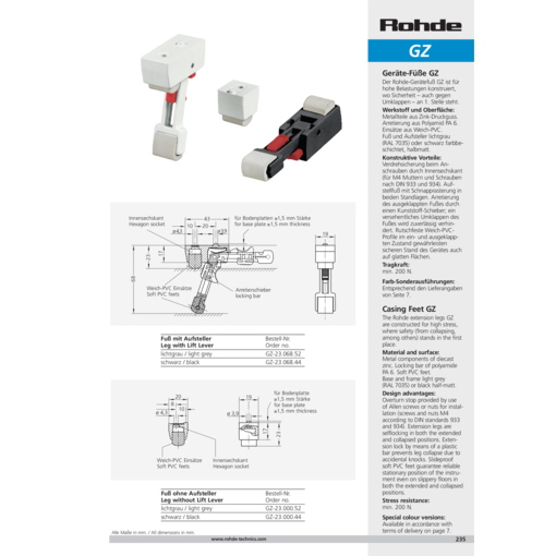 Bloqueio contra rotação durante o aparafusamento com chave hexagonal (para porcas e parafusos M 4 conforme DIN 933 e 934). Pé basculante com travagem em ambas as posições extremas. O fecho inadvertido do pé aberto é impossibilitado por travagem do pé aberto através de um trinco de plástico. Perfis de borracha antiderrapantes, tanto quando aberto como recolhido, asseguram um apoio firme do aparelho mesmo sobre superfícies escorregadias.