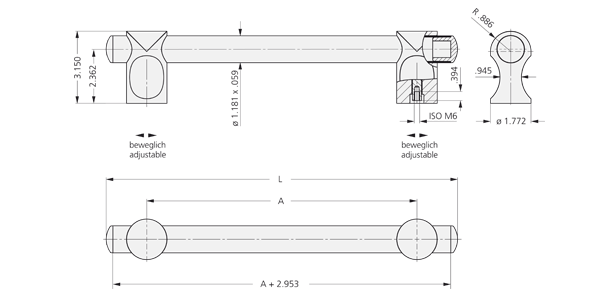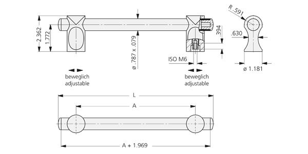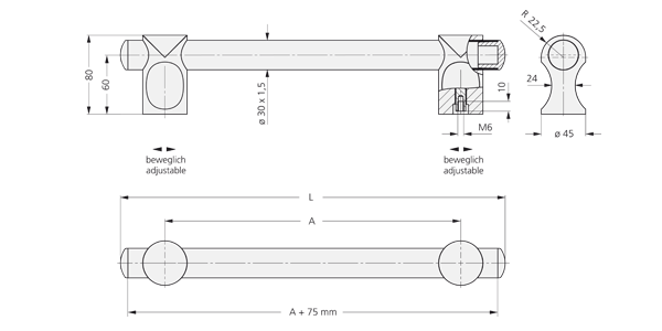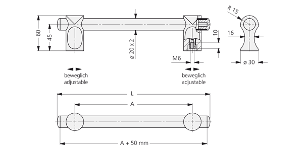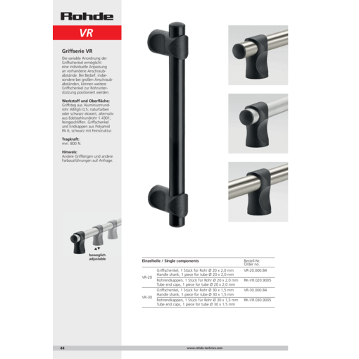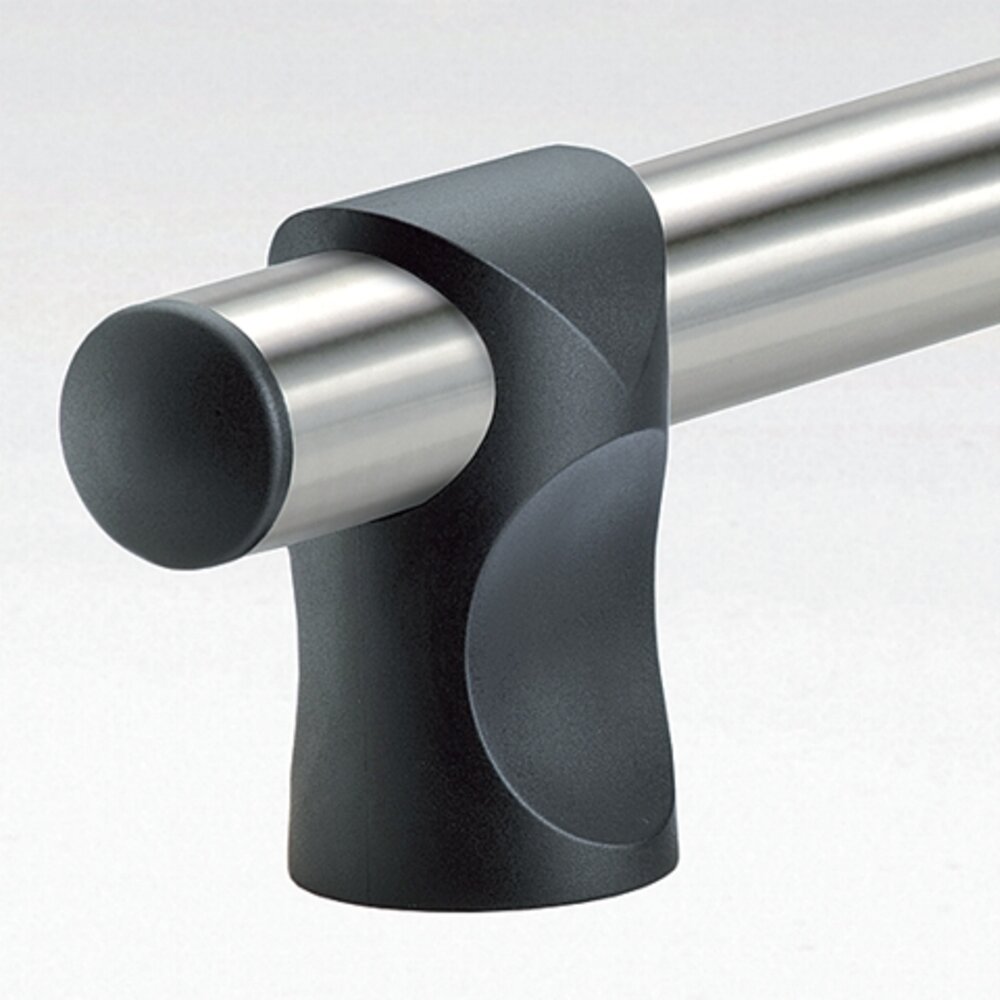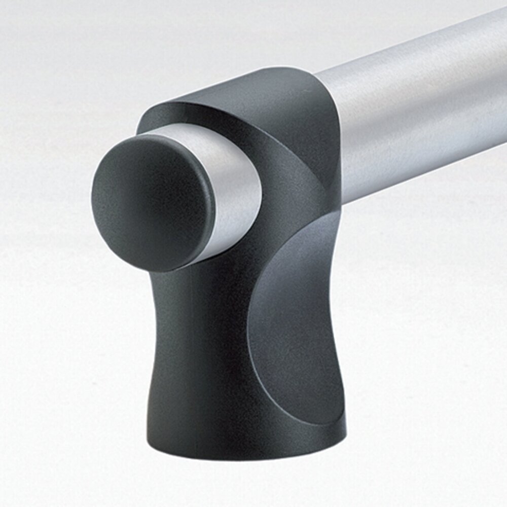 AlMgSi 0,5 yuvarlak alüminyum borudan imal edilmiş tutamak dirseği, doğal renkler ya da anotlanmış siyah, alternatif olarak paslanmaz çelik 1.4301 yuvarlak borudan ince zımparalı. PA6 poliamidden imal edilmiş tutamak kolları ve uç başlıkları, siyah ince dokulu ve paslanmaz çelikten imal edilmiş çıkarılabilir vida dişli ek parça